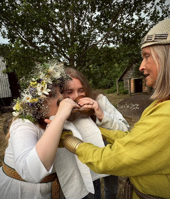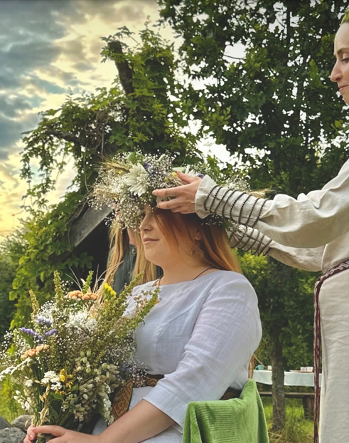 Ślub odbywał się latem, więc biała, lniana sukienka, zamówiona specjalnie na tę okazję, okazała się bardzo wygodnym wyborem. Do tego miałam juostę w moich ulubionych kolorach. Najpierw odbyły się przygotowania. Mój ówczesny narzeczony, a dziś mąż, należy do zespołu Kūlgrinda, wykonującego rytualne pieśni, dlatego czułam, że jego znajomi potraktowali nas po królewsku. Dziewczyny przygotowały dla mnie kolorowy bukiet i posadziły mnie na ozdobionym krześle na wolnym powietrzu, aby nałożyć mi na głowę równie barwny wianek.
