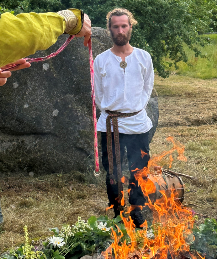 Nie tylko obrączki miały nas połączyć. Kolejnym elementem było symboliczne obwiązanie naszych rąk juostą. Inija oprowadziła nas trzykrotnie wokół ognia, a zebrani obsypywali nas ziarnem na szczęście i powodzenie. Towarzyszyła temu muzyka grana na dudach. Po trzecim okrążeniu kapłanka wypowiedziała słowa błogosławieństwa, które wszyscy zgromadzeni powtarzali. Oboje mieliśmy przygotowane własne przysięgi: mój mąż wypowiedział swoją po polsku, a ja po litewsku. Modliliśmy się do Perkūnasa i Gabiji. Ogromnie poruszył mnie prezent zespołu Kūlgrinda, który zaśpiewał dla nas modlitwę do Gabiji również po polsku.