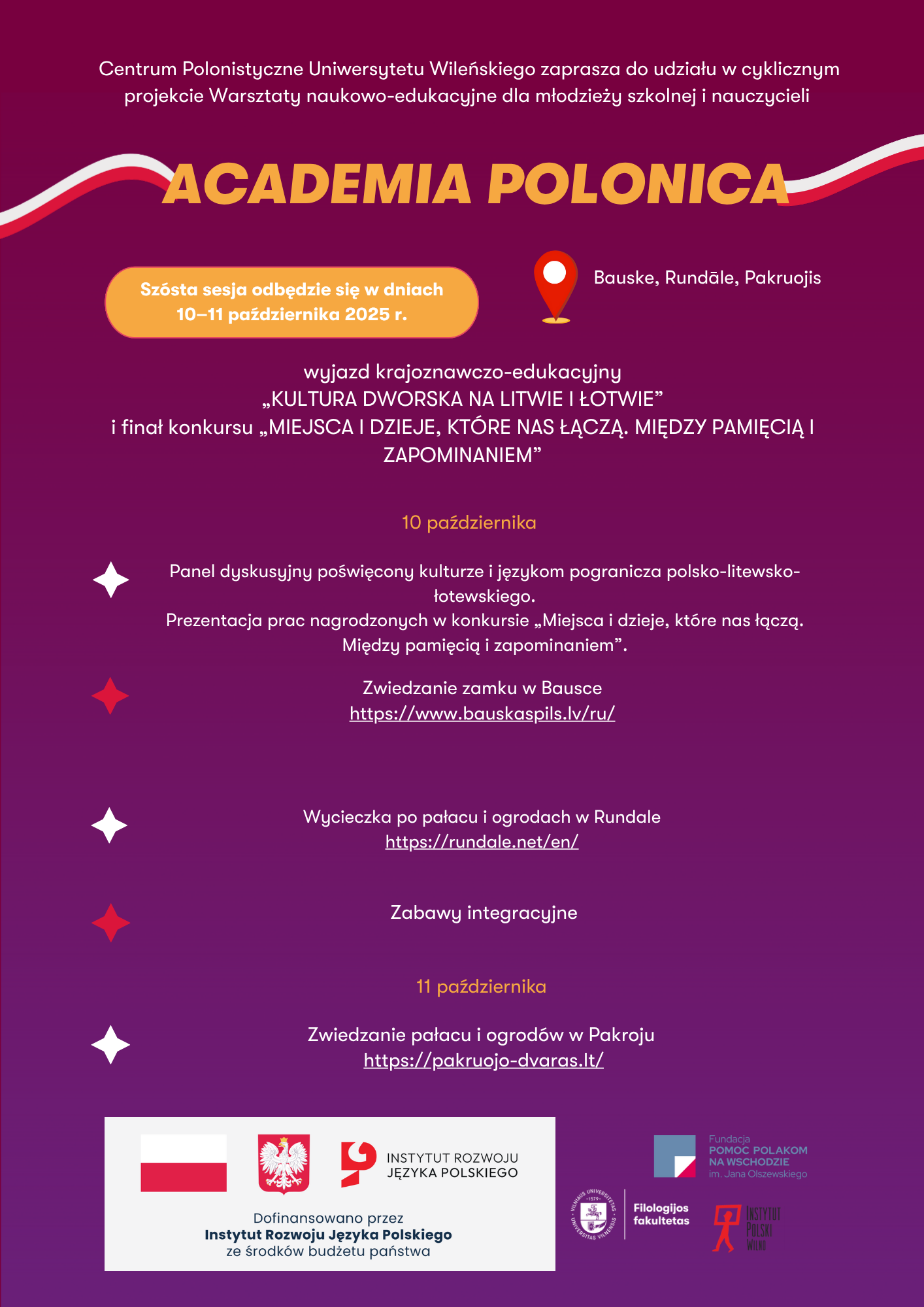 Rozstrzygnięcie konkursu odbędzie się dn. 15.05.2024 podczas drugiej edycji Academii Polonica na Uniwersytecie Wileńskim.
